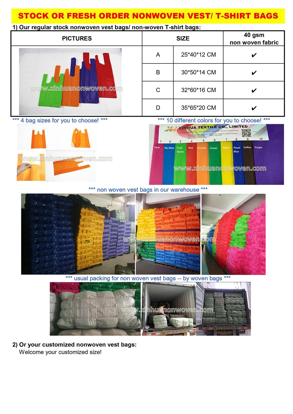 Aktuell kann unser Werk, XINHUA TEXTILE, liefern und produzieren.T-Shirt-Tasche aus Vliesstoff in verschiedenen Farben.