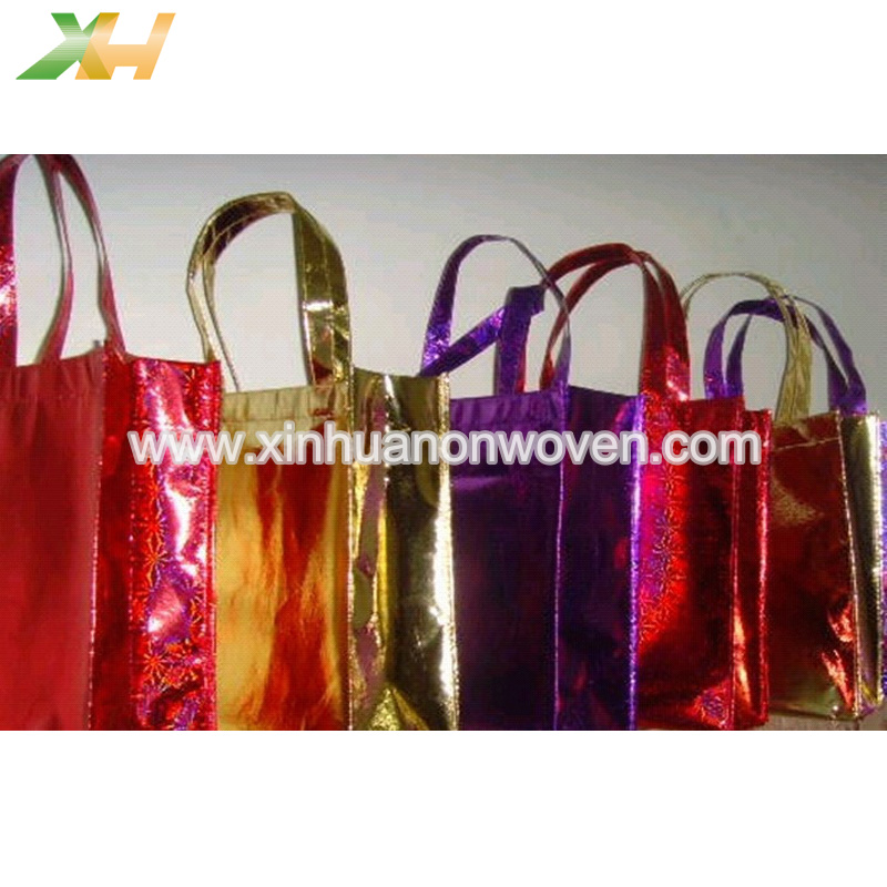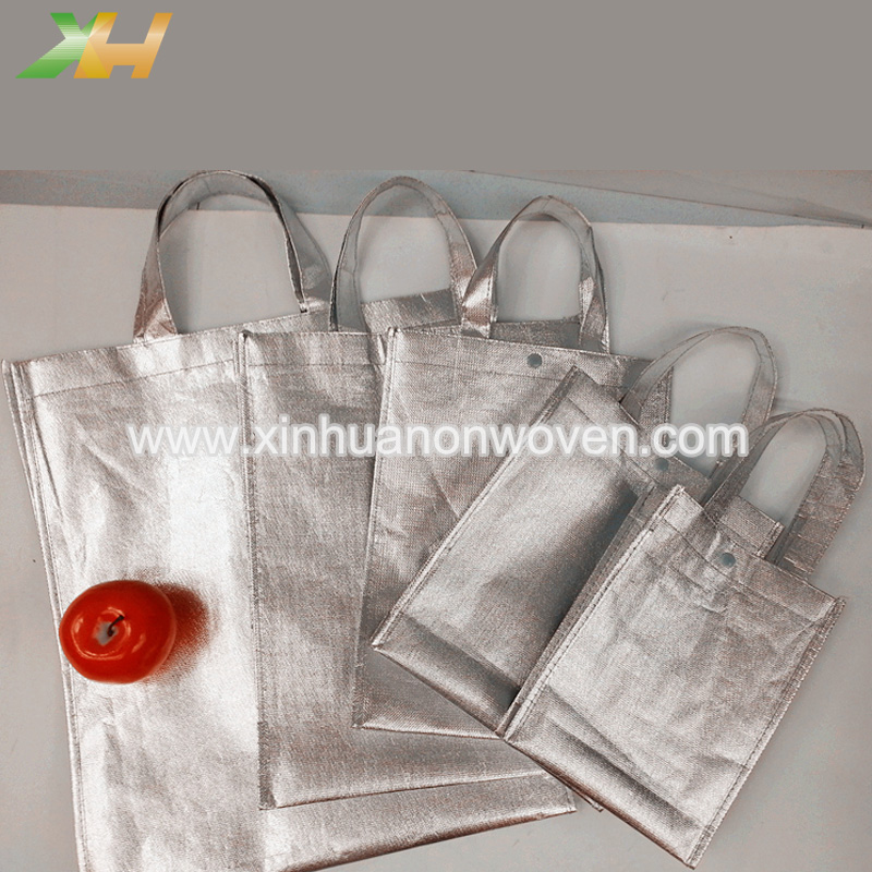 Metallische VliestaschenSie werden in einem Laminierverfahren hergestellt, bei dem die Oberfläche des Vliesstoffs mit einer Folie überzogen und anschließend imprägniert und beschichtet wird. Es handelt sich um eine Kunststofffolienschicht auf Basis eines herkömmlichen Vliesstoffs, die dessen wasser- und feuchtigkeitsbeständige Eigenschaften verbessert und für ein glattes und glänzendes Aussehen sorgt.